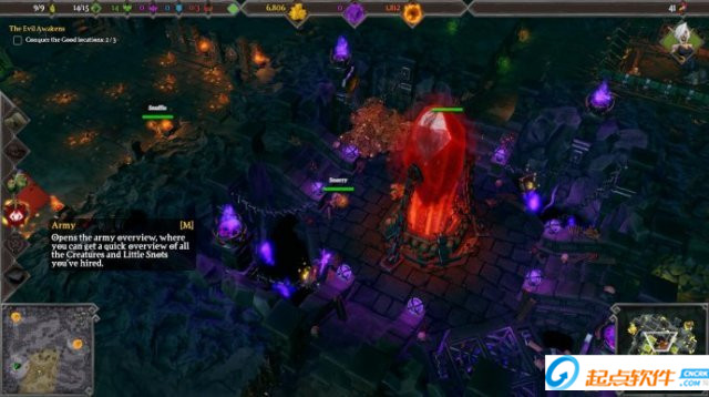 和以往一样,在地下城左键点击你的怪兽和女主就能把它们拎起来投放到地下城任何一个位置,右键是丢下;但在地上行动的时候就要依靠编队,应该还是CTRL+1这样,然后你按1队就能看到所编部队的人头和血量,以及神圣的F2连接着我们。你的英雄和部队要出地下城的时候,一并抓起来,在地下城入口进行投放,回的时候直接右键出入口即可。老样子,没事的时候右键是用来抽打怪兽的。本关地图上有几个小怪的房间,如果你还没有出兵就挖到那里,用达莉亚可以单人扫荡。
