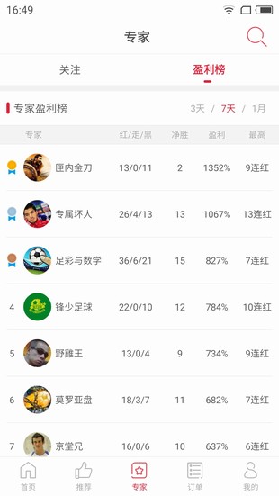 提供3天、7天、1月多维度专家盈利榜单,实实在在为你推荐可靠的盈利专家。
