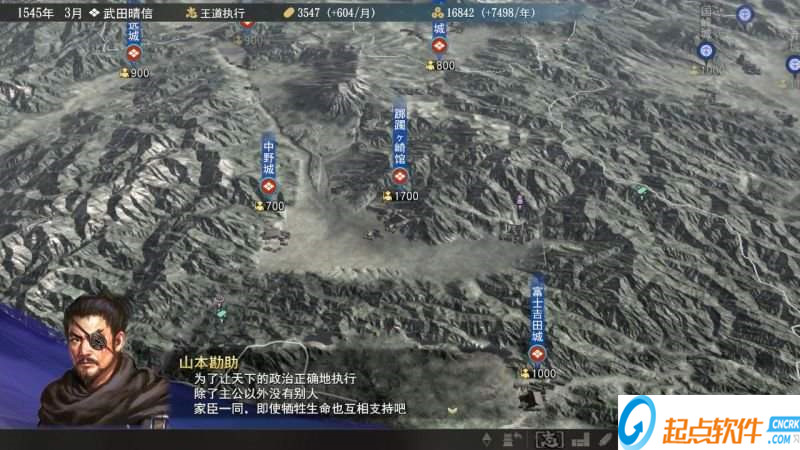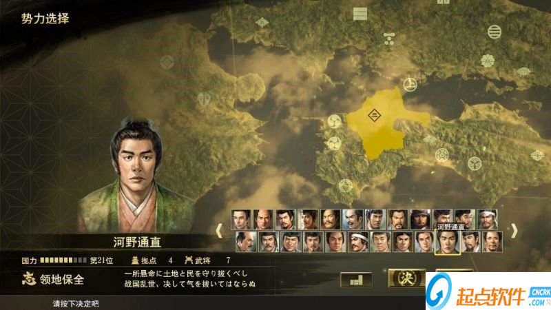 势力:选择好你要进行的时期,玩家就要开始拣选接下来自己操作的势力。拣选势力时,首先呈现在玩家面前的是当代该势力的代表人物(即主公),譬如1545年3月,北条家的代表人物就是“北条氏康”。这时候你要留意四个关于这个势力的重要因素。