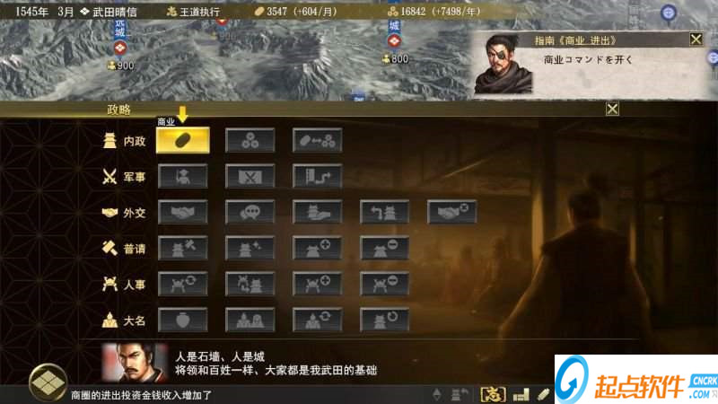 策略游戏嘛,内政算一个大头。但是最近从创造开始就慢慢简化(我好怀念革新的学社和天道的町系统啊),到大志内政系统被进一步简化了。我分命令来说明一下: