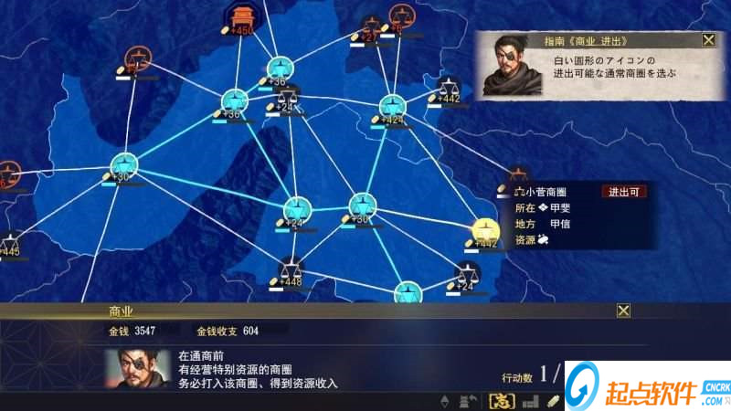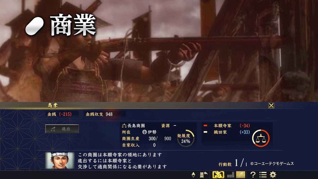 2、商业方面这次主要是对应领地里面各个商圈,首先没有配属的商圈我们要去先花钱进出,和临近的势力的商圈要先通过亲善搞好关系才可以进入去分那个商圈的部分利益。如果对方进出你的商圈你不想分利润给对方可以用独占指令花费一定金钱以该商圈的实力下降为代价而独享该商圈的利润。另外商圈还有特殊商圈和大商圈,这些是不能进出的只能独占,你要先打败该商圈的配属势力才可以独占这些特殊商圈。而大商圈简单来说就是一国内(如山城尾张近江)全部分散的商圈联合起来。敌势力形成大商圈,敌势力被消灭后大商圈也会瓦解,要重新结成。按我进度有两个大商圈,两个的结成条件不一样,山城只是吧山城国内几个商圈进出就可以结成了,而伊势要国内全部商圈都独占才可以结成。对于这个条件是不是每次都是我不好说,但一般最常见情况是你点商业指令,会有家臣提醒你的领地哪里可以结成和条件是什么。