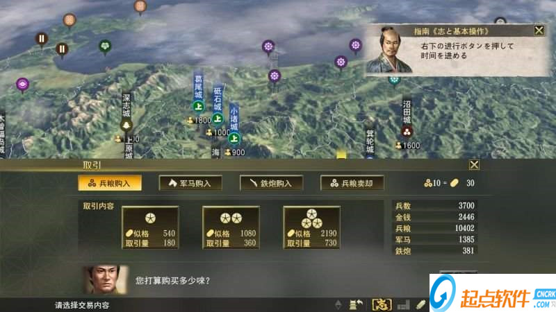 取引:购入的物品可以是兵粮、军马和铁炮。一般购入会分为三个购入方案,分为1倍、2倍、3倍的份量,虽然份量有所增加,但取引的单位价格都是一样的,并没有任何优惠。