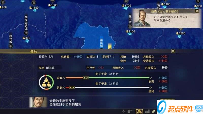 4、募兵方面这次就比以前更真实也是更复杂了其实,一个城的人口分为农民、农兵、足轻、流民(平民)四种。这次大志金钱和军粮没以前作品那么妖艳了,具体是你募兵有两种选择,招农兵你农民就会下降,军粮收入就减少。招足轻就是把流民变成足轻,但是足轻等于你的下属,招足轻要用你的金钱收入换,因为他们不事生产。两种兵的分别是足轻比农兵的战斗力强,战斗后伤兵回复也更快。但他们不事生产,全是你来养(而且很贵)。