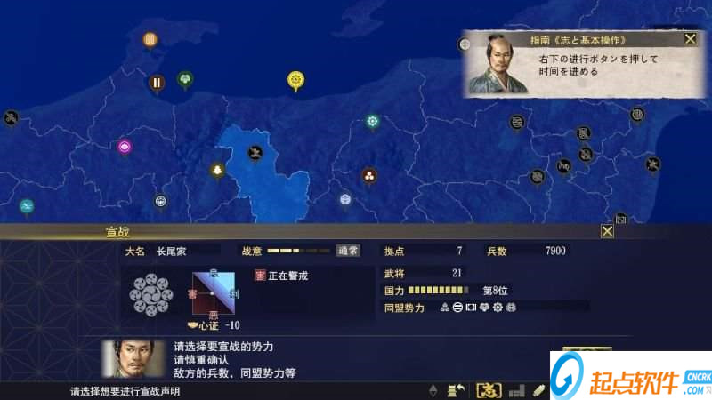 选择要宣战的实力,请慎重确认敌方的兵书,同盟势力等。