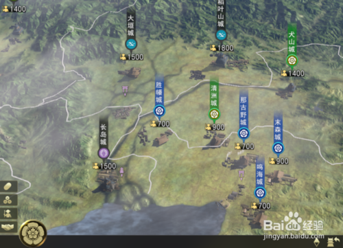 地图:在地图上可以观察到各座城池的分布,每座城池下方都会显示它目前的兵数,当点击一座城池会显示该城池城主的名字,它属于哪个势力、武将人数、兵数、城池耐久度(血量)、兵粮收入、民忠情况、农民数目、流民数目、农兵数目、足轻。旁侧圆环图表示还有一个农民、流民、农兵的比例情况。除了城池外,地图上还会有一些特别的功能地点,譬如温泉(紫色图标)、神社/寺庙(紫色图标)、商圈(绿色图标),去到这些地方可以获得多种多样的帮助。
