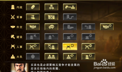 内政:分为商业、农业和贸易。利用商业的进出投资金钱增加收入;据点中进行农业生产就可以加大兵粮收入;与各个地区的商人进行买卖。