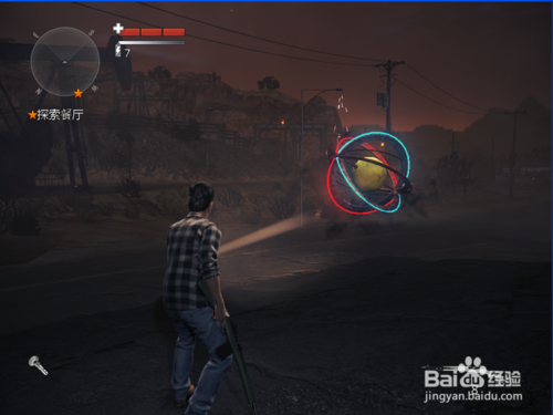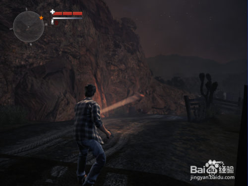 2.两件必备品都拿到了,然后对付第一个敌人,首先是用手电筒照住破坏他的黑暗罩 接着用手枪攻击就行,之后会有一个胖子黑暗魅影出来 可以不用理会,一路出去山洞 CG过后出现一大群敌人 现在是只要跑到地图目标处就可以了