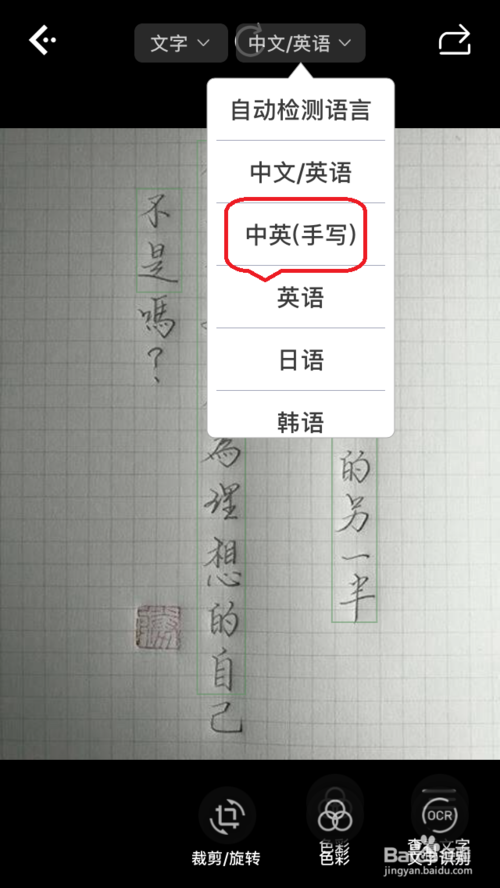 点击上方语言选择下拉框,根据实际需要选择识别语言,比如下图所示的“中英(手写)”识别。