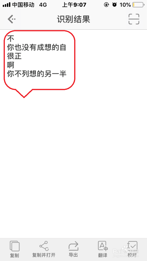 4、在扫描结果中,为大家提供了“复制”、“复制并打开”、“翻译”、“校对”等功能,大家可先进行校对,查看准确度,然后可进行复制,或者是翻译,翻译可翻译成多种语言,比如英语,翻译如下,翻译之后点击翻译框左边复制按钮,可便捷复制翻译的内容。
