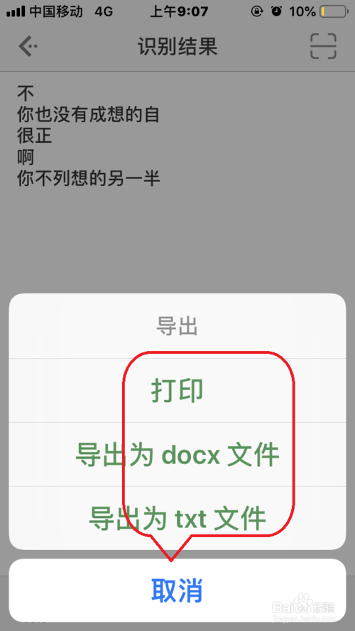 点击底部“导出”,根据实际需要选择“打印”、“导出为DOCX文件”、“导出为“TXT”文件,即可将识别的文字导出。
