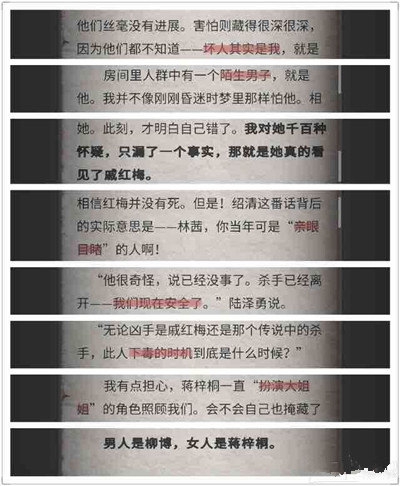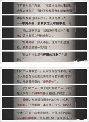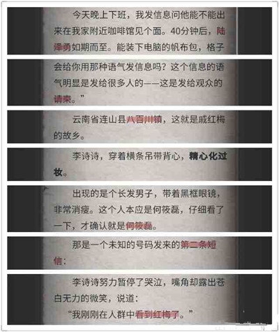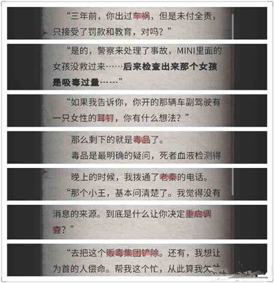 想要快速找到隐藏线索的小伙伴可以尝试下在查看信息的时候点击试管,然后点击自己感觉有疑惑的的文字和词语,如果是隐藏线索的话,文字就会变成红色,不是则只有水墨动画!