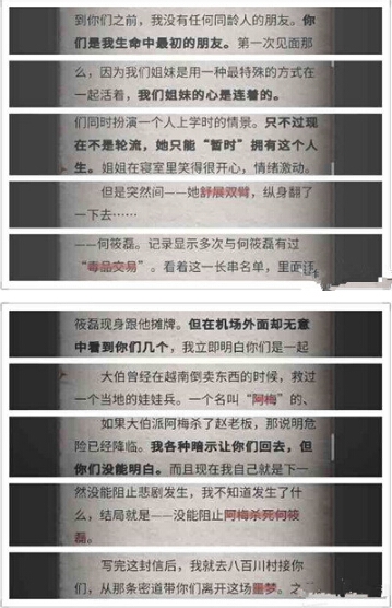 按照信中所说的,红梅姐姐小时候在一起生活,妹妹上大学后去了大伯那里,没上过大学,贩毒,然后自杀;红梅妹妹,小时候在一起生活,上大学、逃亡、复仇。