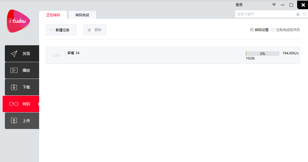 打开itudou播放器,选择一个已经下载好的视频,点击【转码】(如下图)。