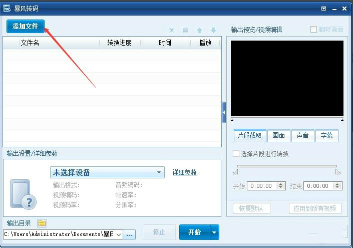 1、首先,我们打开电脑上的暴风转码软件,接下来我们点击下图箭头所指的【添加文件】