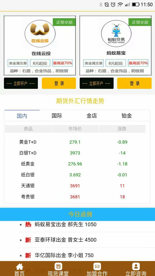 现货返佣是一款进行商品交易的手机商务app,我们可以在现货返佣APP上寻找到各种不同的现货投资项目。然后你可以选择自己感兴趣的项目进行投资,获取收益。