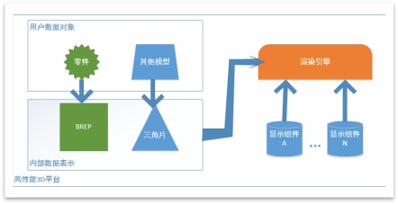 (1) 面向机器人生产线的高性能3D平台新建的3D平台可实际应用于机器人生产线。在此平台上,用于生成轨迹的零件用B-Rep表示,以保证加工精度。其他模型用三角片表示,以提高性能。渲染引擎采用插拔式设计,便于底层显示组件的切换。用户数据对象、内部数据的表示以及渲染引擎构成了合理的存在运作体系。