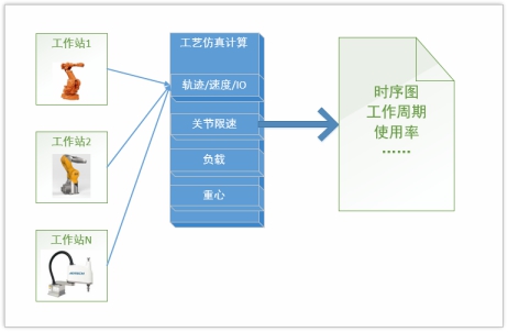 RobotArt的工艺规划仿真系统面向机器人生产线,以运动设备所拥有的轨迹为基础、结合自身的关节限速与负载重心等,计算出时序图、使用率等。