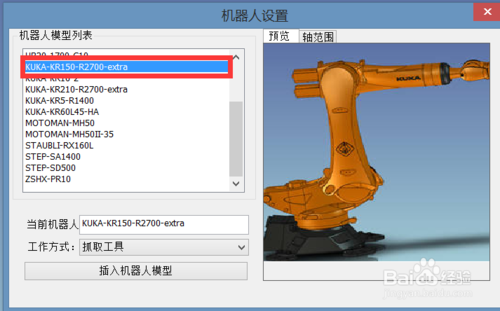在弹出的机器人设置界面,选择【KUKA-KR150-R2700-extra】,工作方式选择默认的,抓取工具。如图2所示:
