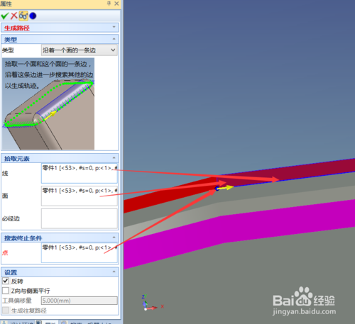 在弹出的属性面板中,【类型】选择沿一个面的一条边,拾取元素,线,面,搜索终止条件点,当左边的拾取元素字为红色时,处于可编辑状态,在绘图区的油盆上,点击一下红色面里边的一条线,接下在拾取元素面的空白处,点击一下,再在绘图区点击一下红色的面,以油盆的一圈为例,所以终止条件选择已选线的起始点,如图所示: