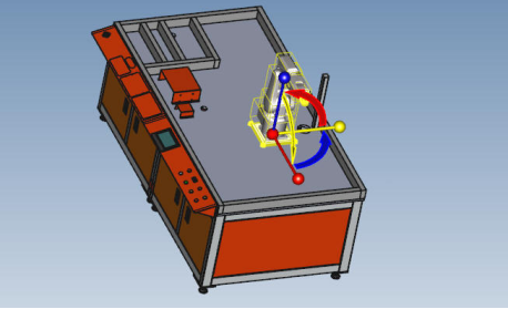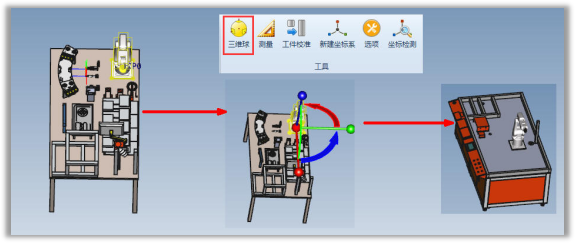 在涂胶与码垛中,只要保证机器人与工件的相对位置保持一致即可,机器人的位置和实际环境中相近也满足要求。在这里,我们用三维球将机器人移动到工作台上。