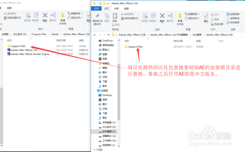 打开安装包的汉化程序,选择Support Files整个文件进行复制,然后题解黏贴到AE的根目录的Support Files文件进行替换。复制过程中有很多文件需要替换,点击替换即可。这样软件就可以进行汉化了,再次打开软件就是中文版本。