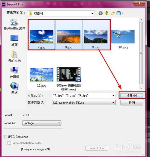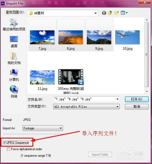 导入的素材文件可以是单张的图片,视频文件,还可以是序列文件,如果是导入序列文件,点击窗口中的“导入序列”在前面打上勾便可完成!