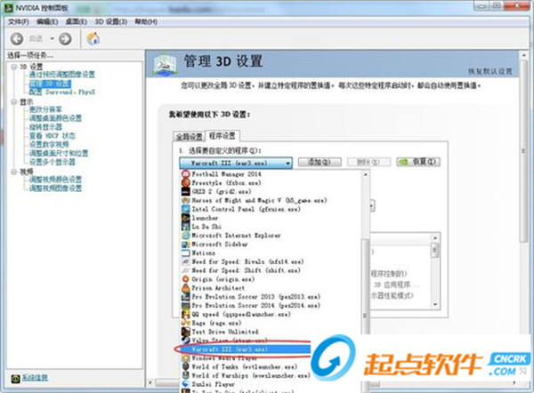 4.选择war3程序,如果列表里没有,点击“添加”按钮,在你安装游戏的盘符里找到war3.exe,此处注意是一个空白物色的图标,不要添加其他图标,不然会让你放入游戏CD。