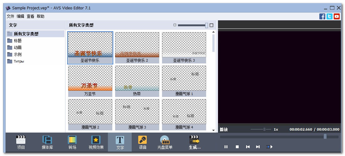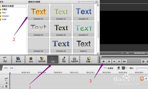 添加文字,也非常的简单,这里提供了很多的文字动态特效,右侧的播放可以展示这些特效,方便大家进行选择。