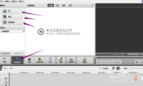 首先我们第一步是导入视频文件,如果没有的话可以捕获或者屏幕捕获,捕获是开启的摄像头功能,屏幕捕获和屏幕录制基本一样。