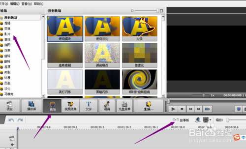 转场是多个小视频文件之间的一种连接效果,点击故事板以后可以拖动视频文件到下方操作场中,转场里面提供了非常多的特效供我们使用。