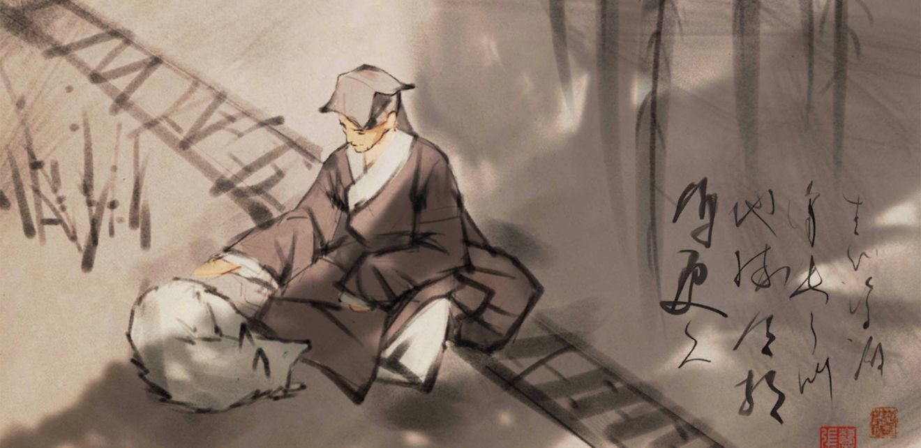 庭院左方洗砚池将脏砚台洗净,得到干净的砚台。
