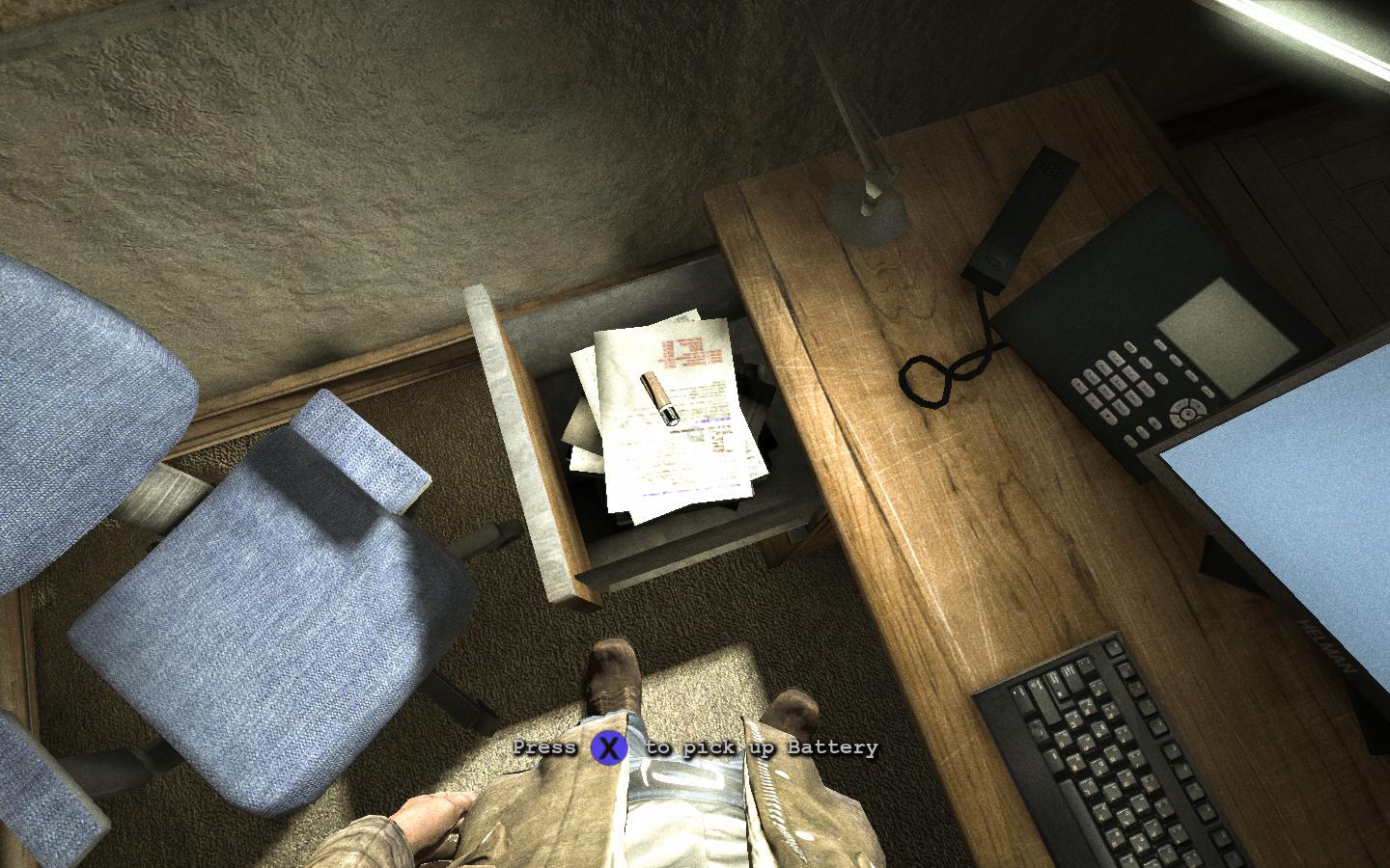 三剧情结束之后,可以先逛一逛病院大厅,在厕所可以找到电池,在必定会经过的路上会看到一本书,走到一个有一辆轮椅的走廊上,到底后看到三个疯子在看电视,这三个不会出来攻击主角,放心通过,到一个被封住的门的门口蹲下进入对面房间,在对骂房间内的会议桌下有一个电池,在尸体上找到门卡之后返回到刚刚的大厅(轮椅上的疯子会袭击主角),从一扇铁门里到保安室。
