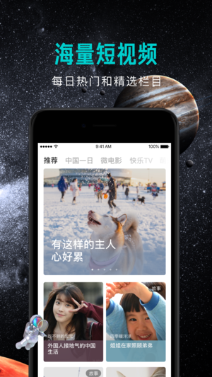 宇宙视频app是全新的资讯类短视频应用,宇宙视频app每天精选全球优质的故事,用智能算法个性化推荐,以竖屏轻松看短视频。在宇宙视频app看视频全程无广告困扰、单频道信息流解决你的选择困难症,还有宇宙视频app精心定制三大特色栏目,让你看过瘾。