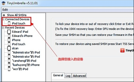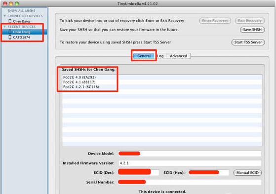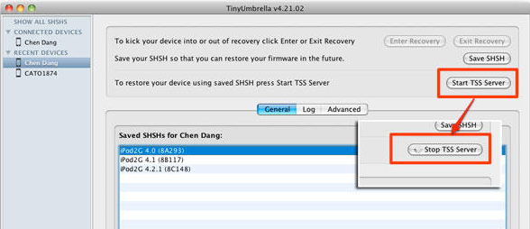 第一步、将需要降级的iOS设备连上电脑,运行TinyUmbrella,选择希望降级的系统版本SHSH备份,之后点击“StartTSSServer”;