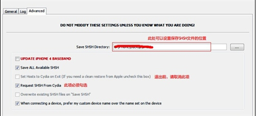 2、选择Advanced标签,对小雨伞进行一些设置,建议设置下保存SHSH文件的目录:
