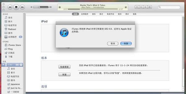 第三步、之后iTunes将会提示“iTunes将抹掉iPod并将它恢复到iOS4.0,还将与Apple验证此恢复”,无视该提示,点击“恢复”即可;
