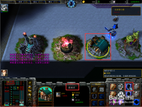 然后再去盾商店,购买属性护盾,3000金币,增加200防御力,全属性增加500。全属性比较重要,就是智力,力量,敏捷都增加500