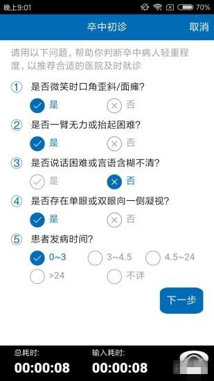【快速识别】在首次医疗接触时帮助快速识别疑似卒中患者,早发现早救治。减少早期误诊占用医疗资源。自动记录初筛时间。