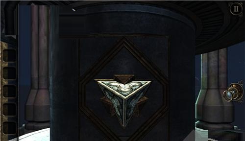 第三章与前两章一样,将获得的新三棱体魔盒放置于白色三角形位置上,泥水中会冒出一个锁门的把手。将该把手放置到对应方向的那扇门上,就会发出光速,通过门上的机关将光束折射到小孔中,门便会开启。 进入第三间房间后,依旧是通电和打开投影机,不过调频的操作与前