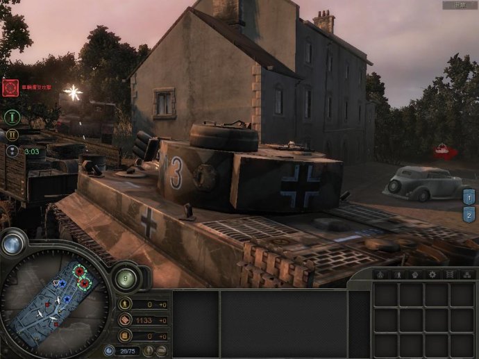 之后就是漂亮的坦克秀了,任务指令是摧毁村庄内的反坦克炮,之后摧毁所有敌军装甲部队,虎式坦克的防御和攻击都是很优秀的,一路杀进村子就可以了,注意对付装甲车的时候换上穿甲弹,攻击建筑物的时候换上高热爆弹,而且时刻保持用坦克的正面装甲对敌,基本上就不会有危险了,玩家控制坦克的时候可点右键攻击,也可以选择定向瞄准,用鼠标控制炮塔,点左键射击。一直杀到触发剧情,本关结束