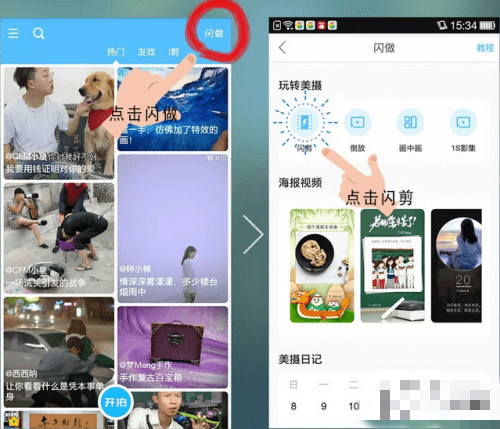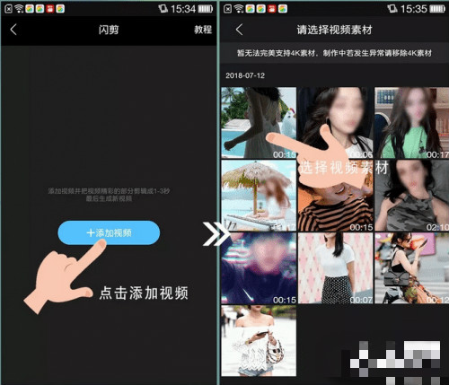 云美摄使用教程:“闪剪”功能是在“闪做”里面的一项,顾名思义很快就可以剪辑成功一个短视频,剪辑编辑视频都非常的快捷,即使是视频制作的小白用户,也可以很快上手!