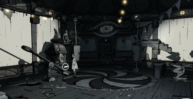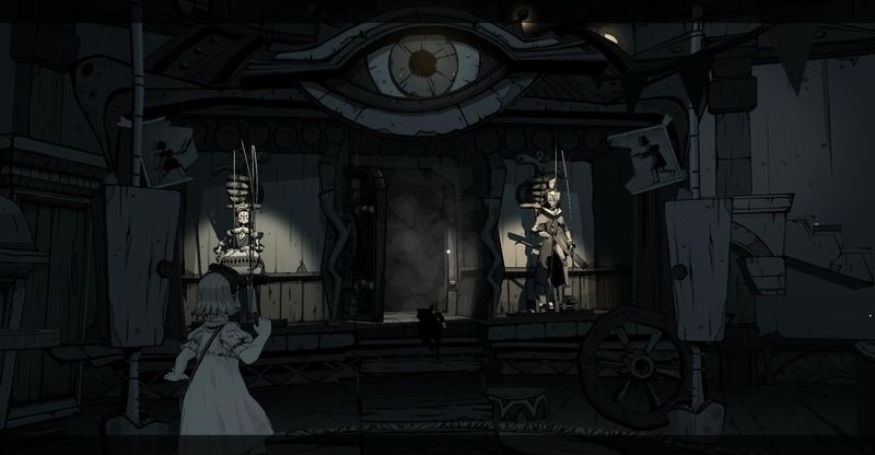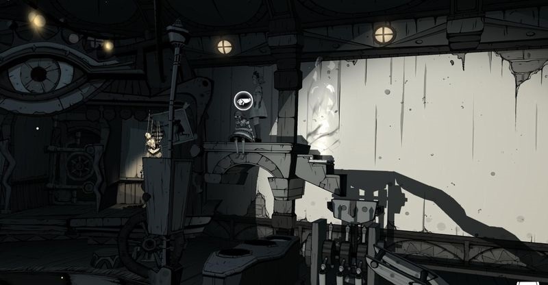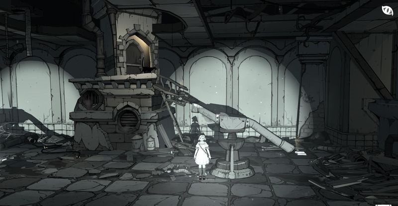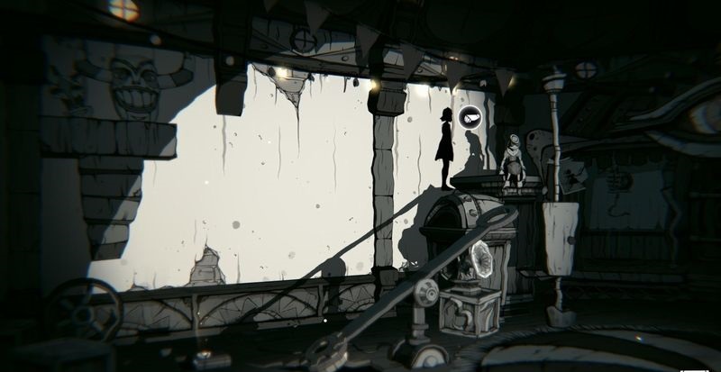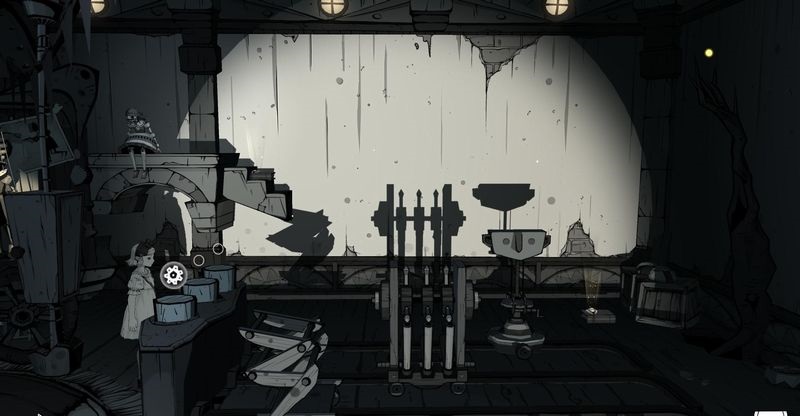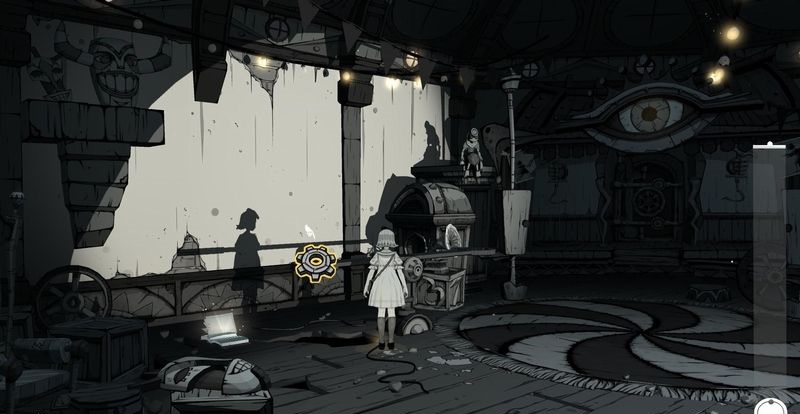 我先说优点吧,除了上面说的第一眼吸引我进来的画面以外,整个光影的想法创意其实挺好的,和黑白的美术风格很符合,而且有些谜题其实设计的不错,我很喜欢前面有一关有一个大机器人让你拼齿轮,影子齿轮这个想法挺好的,有种意料之外但在情理之中的感觉,另外后面有一关是走进了一本大书,那个大书里的场景很有创意,我反正是没在之前游戏中见过类似场景,有一种梦境般的感觉。