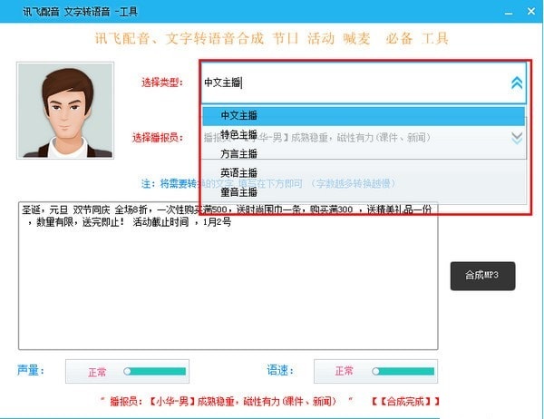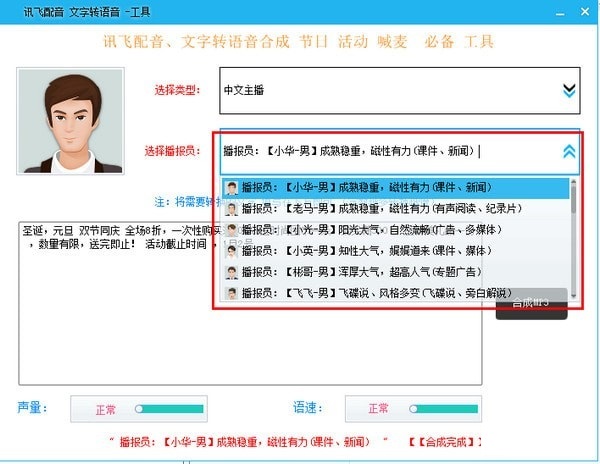 讯飞配音文字转语音工具是一款文字转语音工具,可以快速把文字转换成语音,有多种声音可以选择,可以选择播报员,十分的方便,操作也简单,有需要的朋友可以下载。【软件特点】