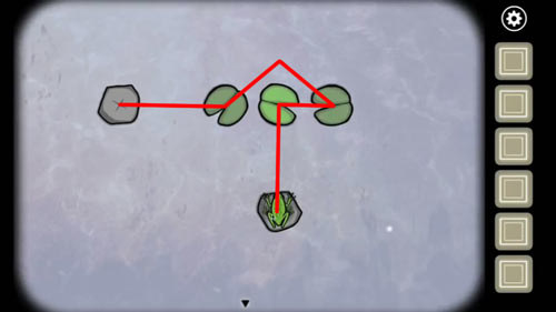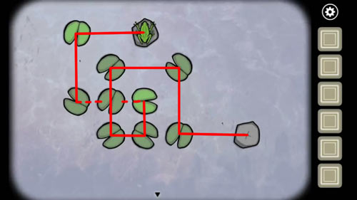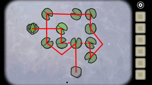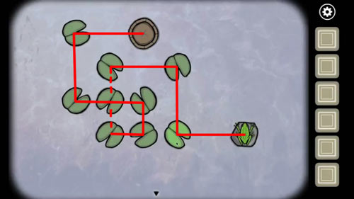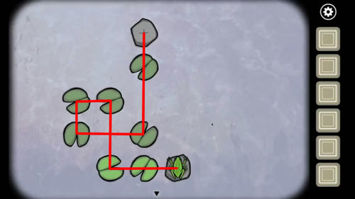 1.调查青蛙,然后控制青蛙跳过每一片荷叶落到石头上,5次以后得到第一只青蛙,过关图如下: