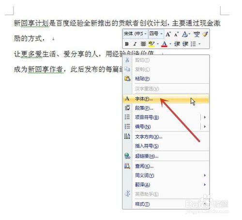 在文档内容的任意位置,单击鼠标右键,在弹出的菜单中点击“字体”(图中红色箭头所指)