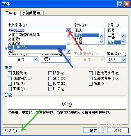 点击“中文字体”栏下的黑色下拉三角形(图中红色箭头所指),在弹出的字体中选取想要的字体,这里选取“仿宋 GB2312”(图中蓝色箭头所指)为例,再点击“默认”(图中绿色箭头所指)