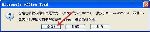 在弹出的对话框点击“是”(图中红色箭头所指),代表“仿宋 GB2312”字体将作为默认字体