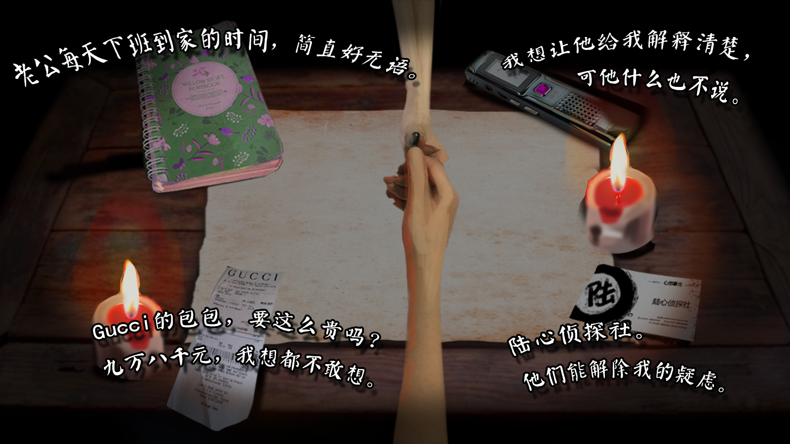 但是由于妻子杜美美已经受到了严重的精神创伤,每个章节初始时,所有的语言片段都是被隐藏看不到的,玩家需要去和场景里的各种物品交互,通过探索物品里的信息,勾起杜美美的回忆。