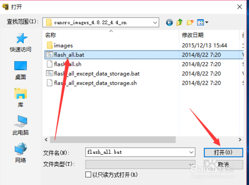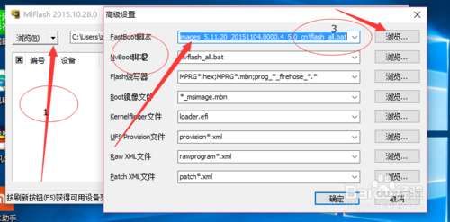 3.最后,将miphone找到打开,点击浏览,然后加载解压包,加载完后点击浏览,选择高级选项,修改第一项,加载flash_all.bat的文件,如下图所示,这就算完成电脑端操作了。