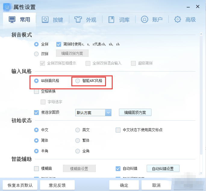 2、在【常用】里边选择【输入风格】即可选择智能ABC的输入风格。